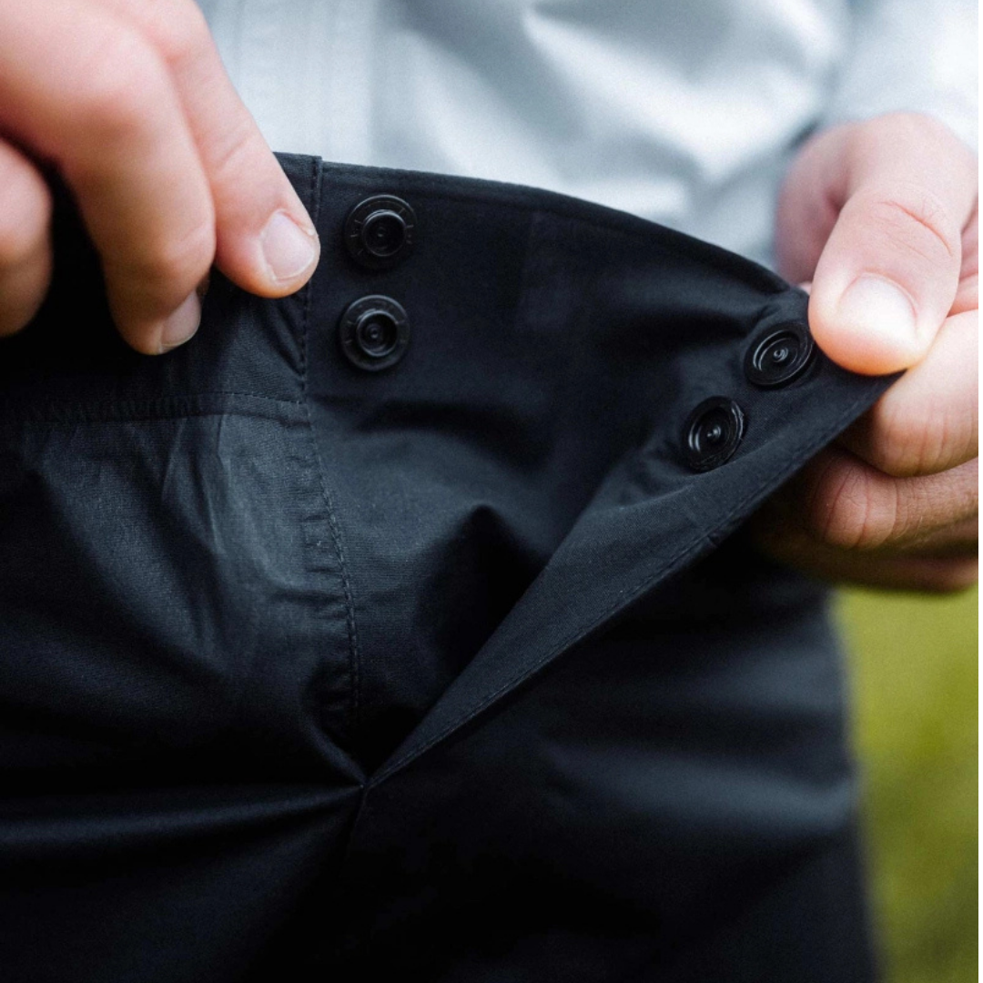 Дизайнът е минималистичен, но мислен до детайл. По-широкият крачол дава повече комфорт и естествено движение, без излишен плат и шум. Водоустойчивият цип по дължината на прасеца ти позволява бързо да облечеш панталона върху обувките – без да губиш време, когато времето се обърне.