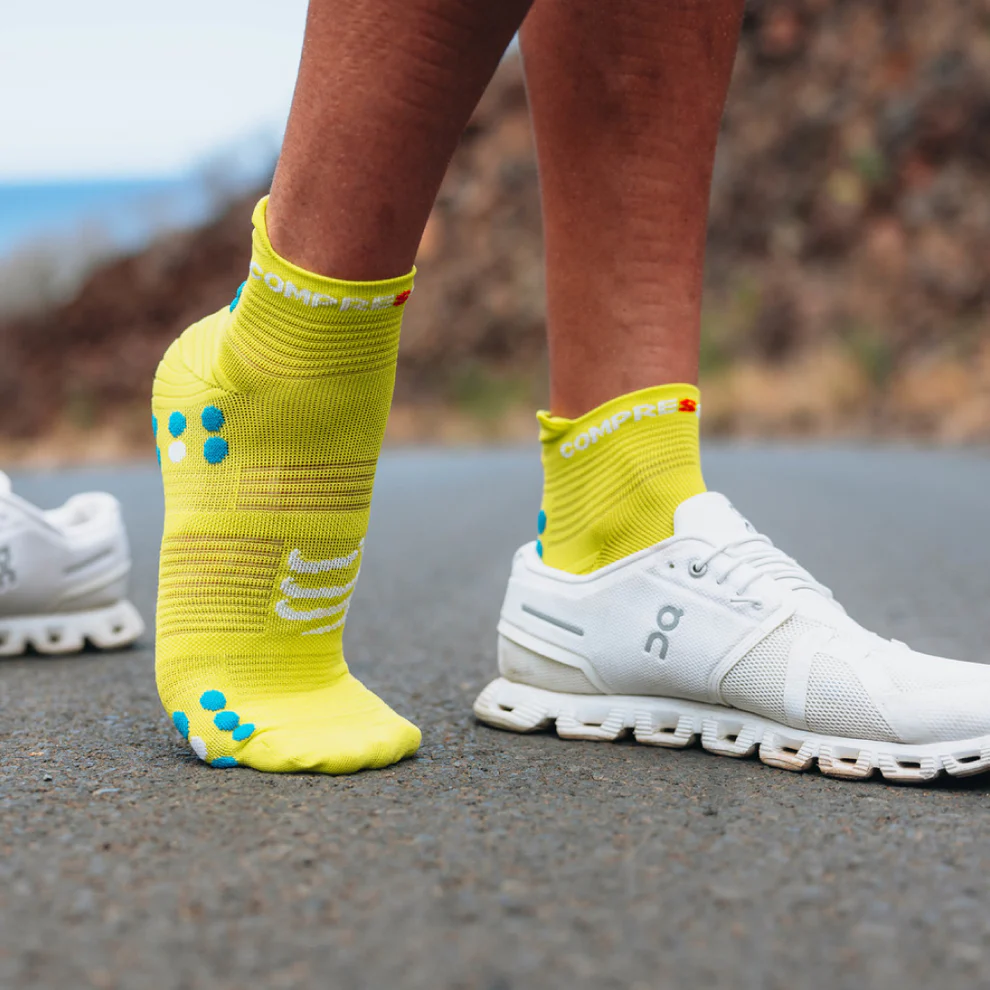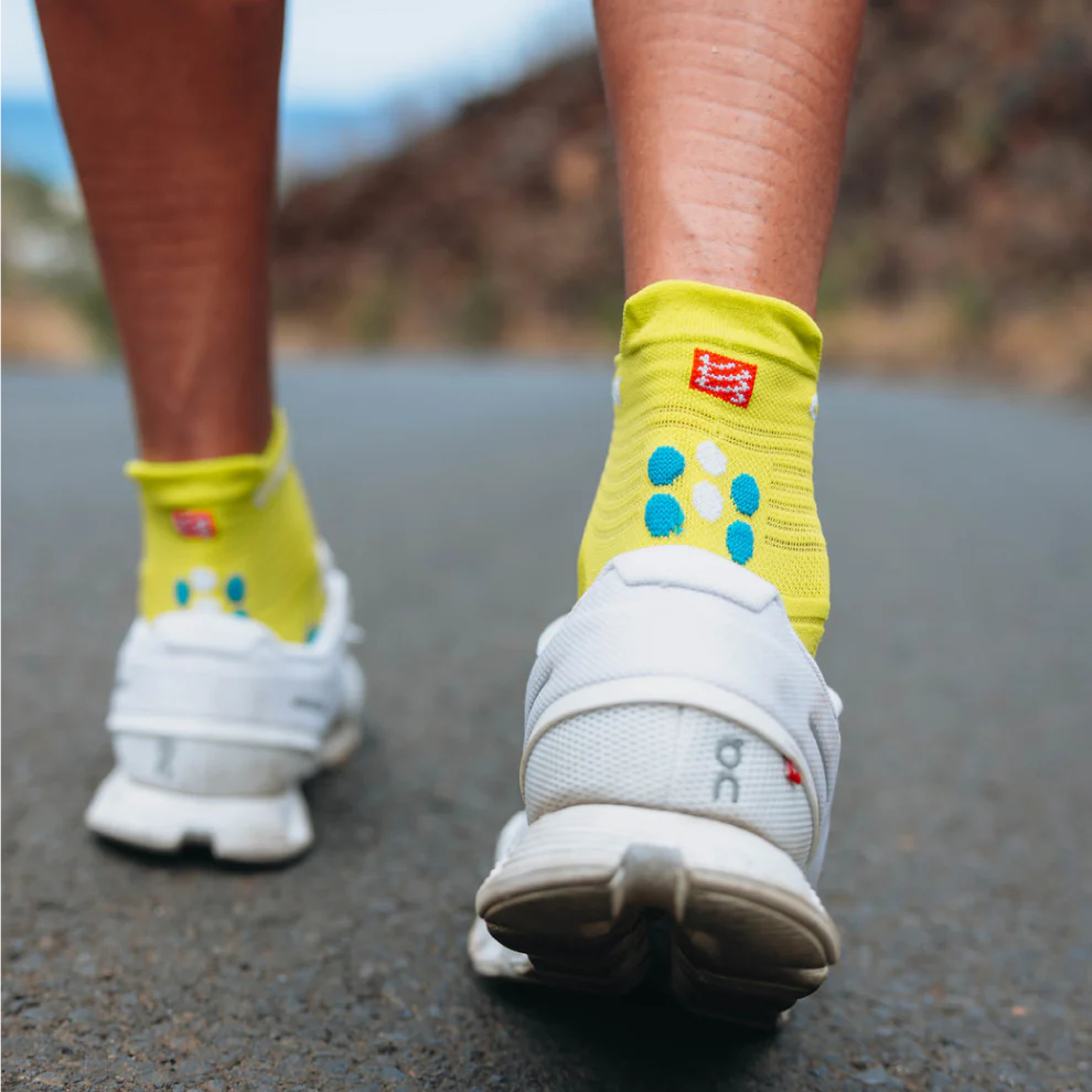 Пробвани и тествани от нашия екип, четвъртото поколение на Pro Racing Socks подобряват вентилирането и защитата от мозоли по време на бягания в горещи условия . Техническата плетка е лека и вентилирана, бързо отвежда влагата, така че краката ви остават прохладни и сухи. Преосмислената, по-широка предна част на чорапите предлага по-ергономично прилягане и подобрена проприоцепция, позволяваща на пръстите да се хващат интуитивно при стъпване за естествна, плавна крачка. Леката плетка около петата, идентична с версията PRS High, предлага насочена подкрепа, когато увеличите темпото, докато платът на палеца предотвратява черните нокти при по-дълги бягания. Новата технология Flat.Dots се присъединява към специалните 3D.dots около ахилесовото съхожилие за допълнително омекотяване и защита. Под краката, технологията 3D.Dots (75%) и Flat.Dots (25%) омекотява удара и предлага допълнително проветряване, захващане в обувката, както и стимулиране, за да се увеличи венозното кръвообращение и да се забави умората. Анатомичното прилягане и технологиите са специално насочени към изискванията на пътното бягане, докато късата дължина гарантира, че прегряването никога не е притеснение.