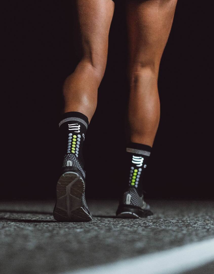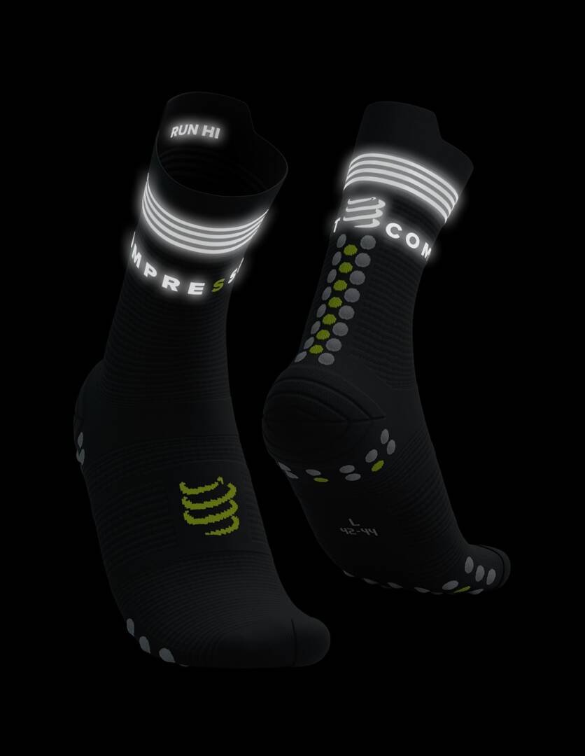 Одобрени от бегачи по целия свят, нашият последен модел чорапи за бягане получава сезонно обновление, за да ви помогне да останете видими и безопасни при слаба светлина. Комбинирайки оптимална вентилация и защита срещу мAзоли със светлоотразотелни елементи – чорапите PRS Run High Flash са чудесен избор за тъмната част на деня. Техническата плетка е лека и вентилирана, бързо отвежда влагата, така че краката ви остават свежи и сухи. Ергономичната предна част на пръстите предлага перфектно прилягане и подобрена проприоцепция, позволявайки на пръстите интуитивно да се приземят и да осигурят естествена и плавна стъпка. Специална плетка около глезена предоставя насочена поддръжка, когато увеличитетемпото. Под ходилото, моделът включва комбинация от 3D точки (75%) и плоски точки (25%), които омекотяват удара и предоставят допълнително сцепление, вентилация и лека микростимулация, за да увеличат венозното кръвообращение и да забавят умората по време на увеличаващите се километри. Височината на чорапа за бягане е по-ниска от моделите за трейл и колоездене, с прилягане и технологии, специално проектирани за изискванията на бягането.